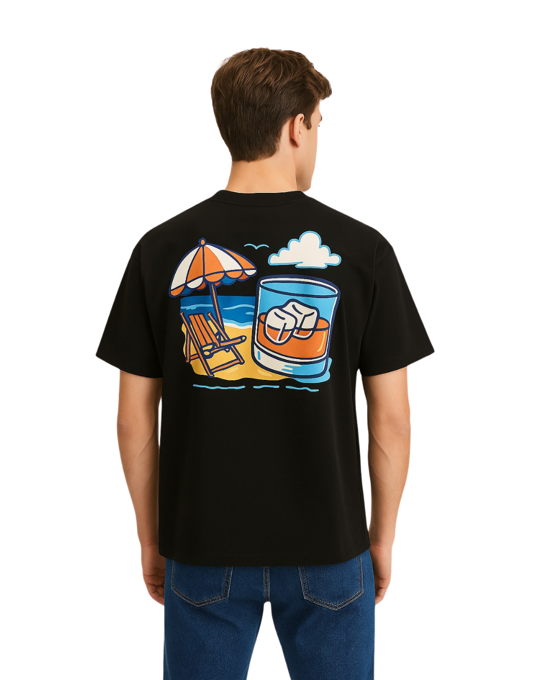 Vibe Check: Relax into coastal energy with the Aagain Men’s Drop-Shoulder T-Shirt in classic black and bold graphic print at the back. Made from soft, breathable cotton, this Regular fit tee features a vibrant beach-themed back print with an umbrella, lounge chair, waves, and a chilled drink—capturing the perfect holiday vibe. With its relaxed drop-shoulder silhouette and bold artwork, this summer graphic T-shirt for men is ideal for vacations, weekend outings, and easy everyday style.